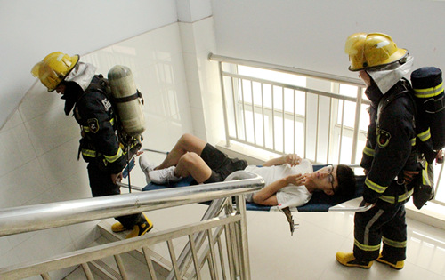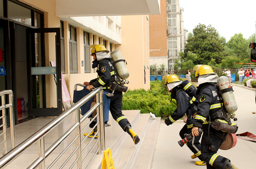 当日下午,罗庄区消防大队王周峰副大队长等领导率领消防中队官兵十余人、四辆大型消防车来到我院学生公寓宿舍楼前整装待命。五点整,学生公寓投放烟雾弹,同时拉响了火灾逃生警笛。陈中队长指挥官兵分三路同时进行演练:一路人员发动云梯车,伸长起吊臂把被困在四楼西侧阳台上的两名同学用吊筐安全抢救下来;一路人员冲入公寓楼内,指挥学生用湿毛巾捂住口鼻、猫腰前行,展开疏散,通过三个紧急出口向室外逃生;一路官兵们利用水枪对准着火房间喷水降温灭火。消防演练按照预订方案,有序、紧张进行。
