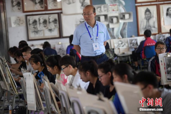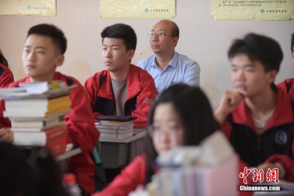 随着高考日益临近,王世卿利用工作生活中的零散时间复习备考,每晚会做模拟习题,有时也会与高考生一同上课学习。图为“高考哥”王世卿与高三学生一同上课备考。中新社记者 武俊杰 摄