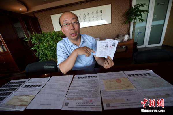 5月21日,山西太原,“高考哥”王世卿展示他之前参加高考的准考证。中新社记者 武俊杰 摄
