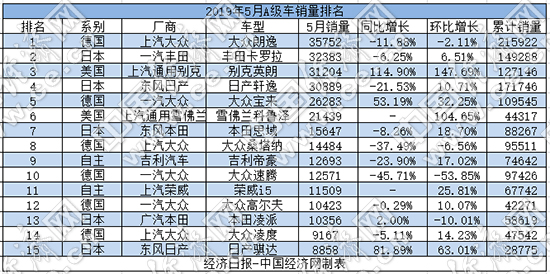 值得一提的是,连续两个月掉出榜单的自主品牌,5月终于再次回归。5月,帝豪销售1.27万辆,同比下滑23.9%。从数据来看,帝豪已经失去了往日的光鲜,但考虑到吉利5月同比下跌27%的业绩,其获得榜单第九名已经难能可贵。除此之外,自主品牌再难有所突破。