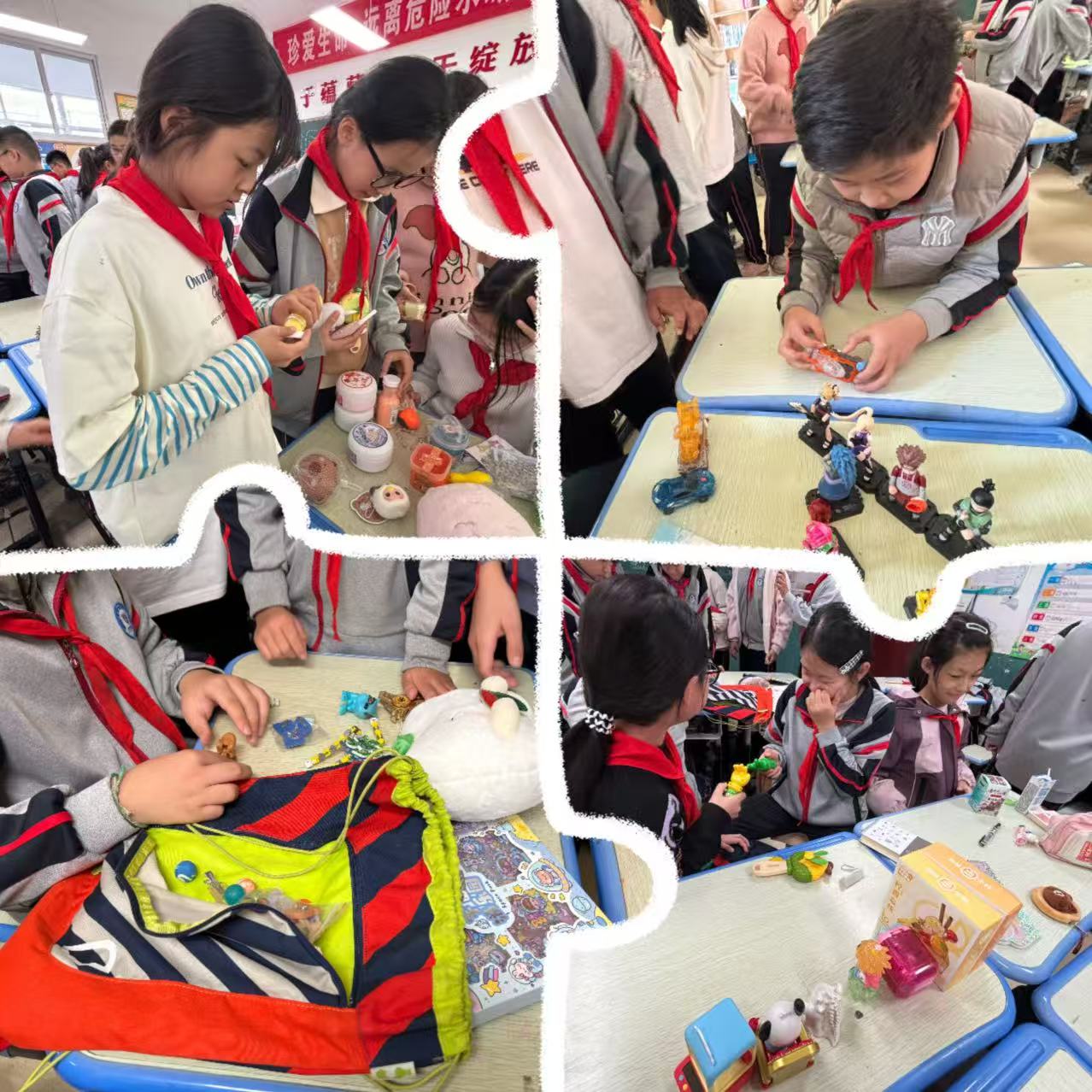 活动开始前,同学们早早将家中闲置的玩具、书籍、手工艺品等整理打包,带到班级活动场地。大家化身小摊主,认真布置自己的专属摊位:有的用彩色卡纸制作个性价签,有的将卡通玩具摆出可爱造型吸引顾客,还有的把亲手绘制的画作整齐陈列…… 一时间,各个摊位上商品琳琅满目,色彩缤纷的物品不仅承载着同学们的心意,更充满了童趣。
