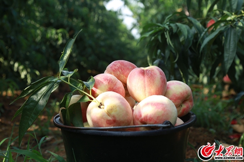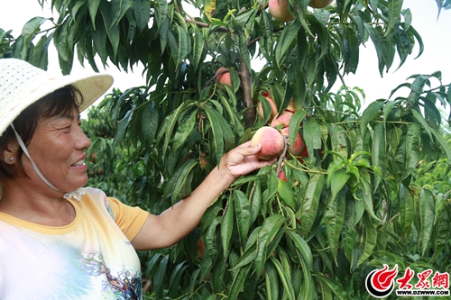 在临沂临港区团林镇中沙沟村崔彭蜜桃种植专业合作社内,一大片桃园跃入眼帘,一个个鲜红蜜桃隐匿在绿叶之下,让人仿佛置身于王母娘娘的蟠桃园里。