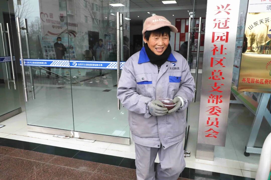 活动现场,志愿者们将一碗碗冒着热气的腊八粥送给社区保洁和保安人员。“这粥真热乎,感谢志愿者专门来慰问俺们,天气再冷,我们的心也是暖的。”接过热乎的腊八粥,保洁人员脸上写满笑意。