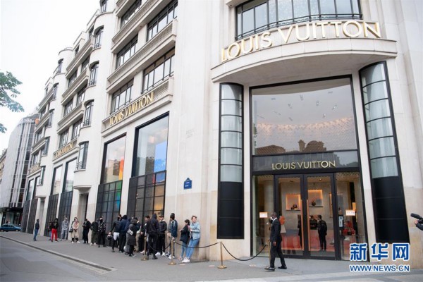 5月11日,在法国巴黎香榭丽舍大街,顾客在一家奢侈品店门前排队。 根据法国政府的解禁计划,自5月11日起,法国开始逐步解封。 新华社发(杰克·陈 摄)